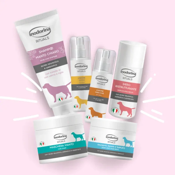 Tutto il necessario per la cura completa del tuo cane: shampoo specifico per tipo di manto, maschera, siero ristrutturante, balsamo zampe, lozioni per occhi e orecchie. Una beauty routine pensata per igiene, benessere e lucentezza del pelo. Ideale per una toelettatura professionale e delicata.