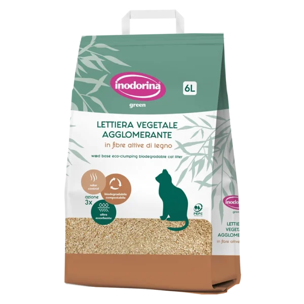 Inodorina vegetable litter is a biodegradable, compostable, and highly absorbent litter. Developed with a technology based on wood fibers that naturally absorb and encapsulate moisture and odors without the addition of chemical additives. Inodorina Green litter can absorb up to 7 times its volume in liquids and ensures maximum comfort for your cat's paws.
