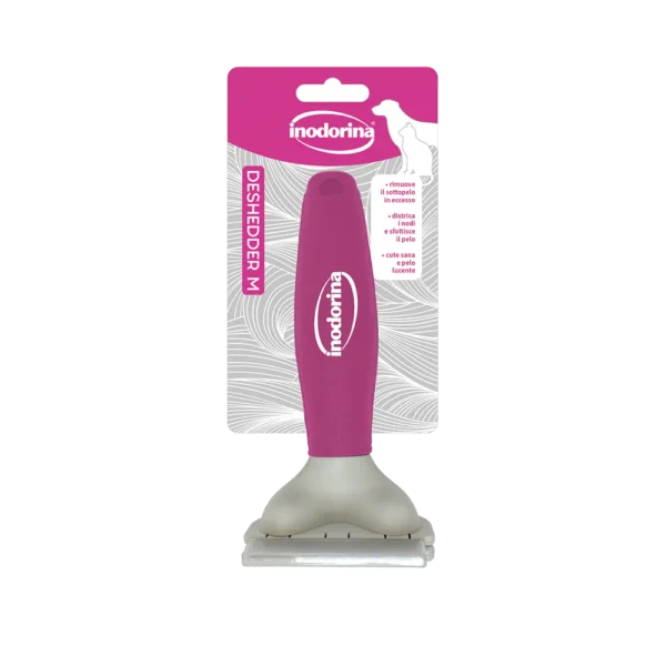 Il Deshedder Inodorina è ideale per rimuovere pelo residuo ed in eccesso in cani dal pelo corto, medio e lungo. Utile anche per manti a pelo duro da tosare regolarmente.