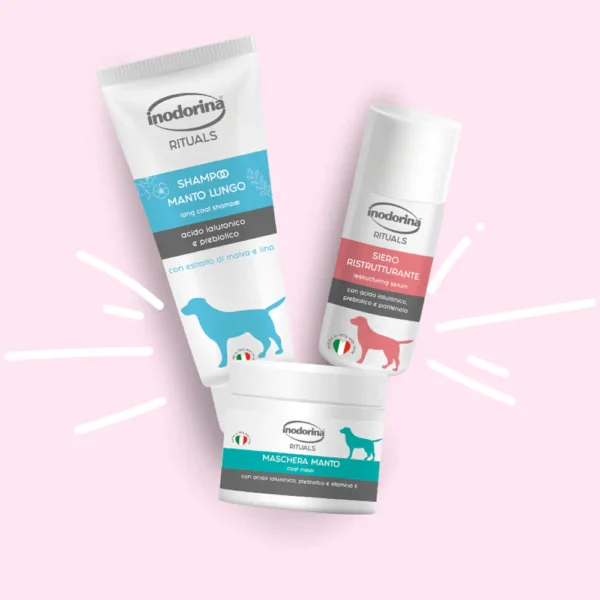 Il kit ideale per prenderti cura del tuo cane a manto lungo, con una combinazione di prodotti studiati per districare, nutrire e proteggere il pelo. Lo Shampoo Rituals, la Maschera Rituals e il Siero Ristrutturante agiscono in sinergia per sciogliere i nodi, rendere il pelo più morbido e luminoso, e garantire una detersione delicata ma profonda. Una routine completa per il benessere e la bellezza del tuo amico a quattro zampe.