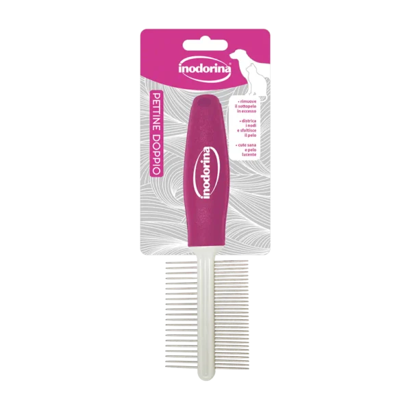 Il Pettine Doppio di Inodorina è ideale per rifinire il pelo dopo la toelettatura, rimuovere i nodi ed eliminare il pelo in eccesso nei periodi di muta. Dotato di denti con punte arrotondate per non irritare la cute delvostro amico. Denti larghi su un lato per sciogliere i nodi; denti stretti sull’altro per eliminare il pelo residuo.
