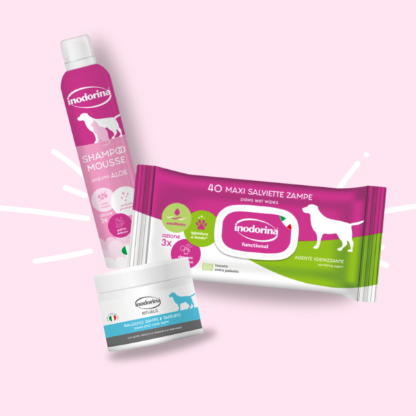 – Shampoo Mousse Inodorina: deterge senza acqua, delicato su manto e pelle, lascia il pelo morbido, lucente e profumato a lungo. Disponibile in 4 fragranze: Talco, Aloe Vera, Delicato, Latte e Vaniglia.